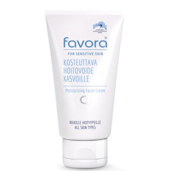 Hajusteeton ja hellävarainen Favora Kosteuttava Hoitovoide on herkän ihon luottotuote, joka kosteuttaa kasvoja tehokkaasti ja pitkään.