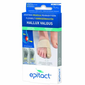 - Epitact Hallux Valgus joustava varpaanoikaisija on päiväkäyttöön kehitetty ukkovarpaan virheasentoa korjaava tuki, joka tukee varpaan asentoa liikkuessa. Joustava oikaisija korjaa varpaan asennon välittömästi, kun sitä käytetään kengässä. Saatavana S, M ja L-koossa.
